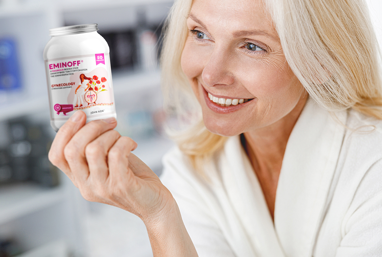 Το EMINOFF είναι ένα φυσικό συμπλήρωμα διατροφής σε μορφή κάψουλας, το οποίο περιέχει έναν επιστημονικά μελετημένο συνδυασμό φυτικών εκχυλισμάτων και μετάλλων που δρουν συνεργιστικά για την ανακούφιση των συμπτωμάτων της εμμηνόπαυσης, δημιουργήθηκε με γνώμονα τη γυναίκα που θέλει να επανακτήσει την ισορροπία, την ηρεμία και την ποιότητα ζωής της.